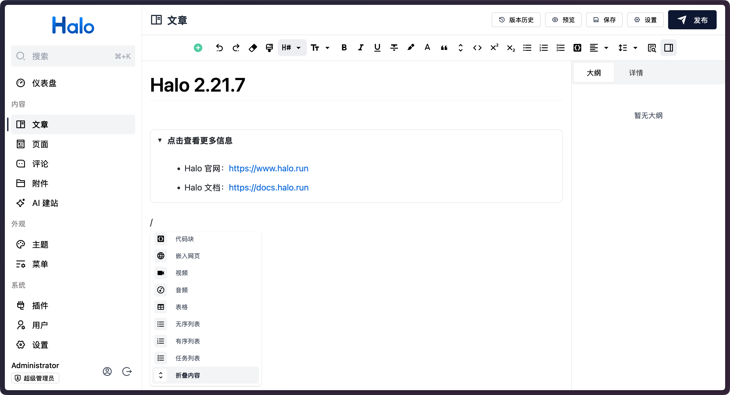 在 Halo 2.21.2 中,我们为编辑器添加了内容折叠的功能,你可以将文章中部分过长内容折叠起来,让访客点击之后才显示。
