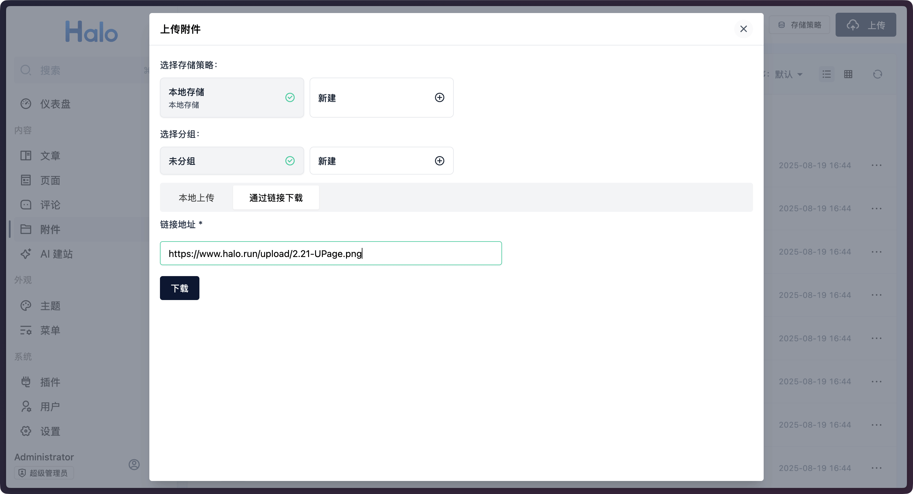 在 Halo 2.21.3 中,我们为附件库的上传界面添加了 通过链接下载 的功能,可以实现输入一个外部的下载链接,然后直接下载到附件库。
