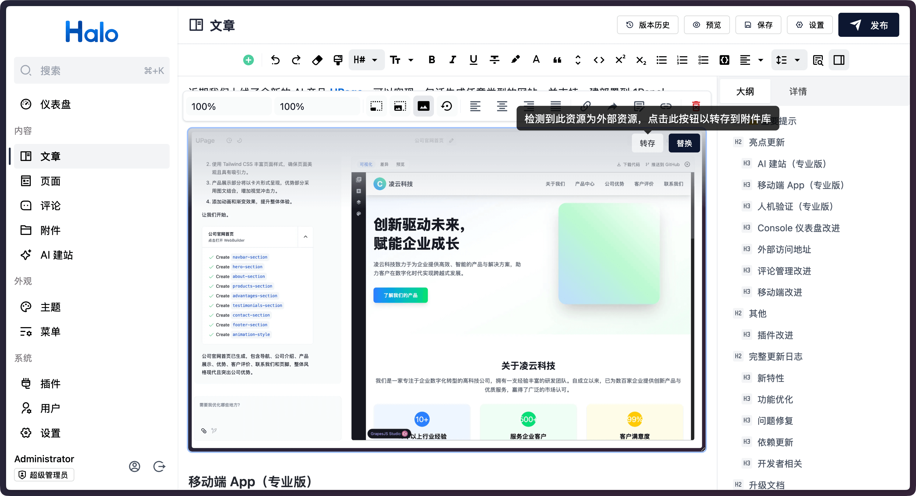 在最新发布的 Halo 2.21.7 中,我们在编辑器中添加了外部资源一键转存的功能,如果你想将其他地方编写的文章复制到 Halo 站点中并同时上传图片,那么这个功能将非常方便。此外,除了粘贴文章时支持一键转存,还可以在后续针对单个图片、视频、音频进行转存操作。