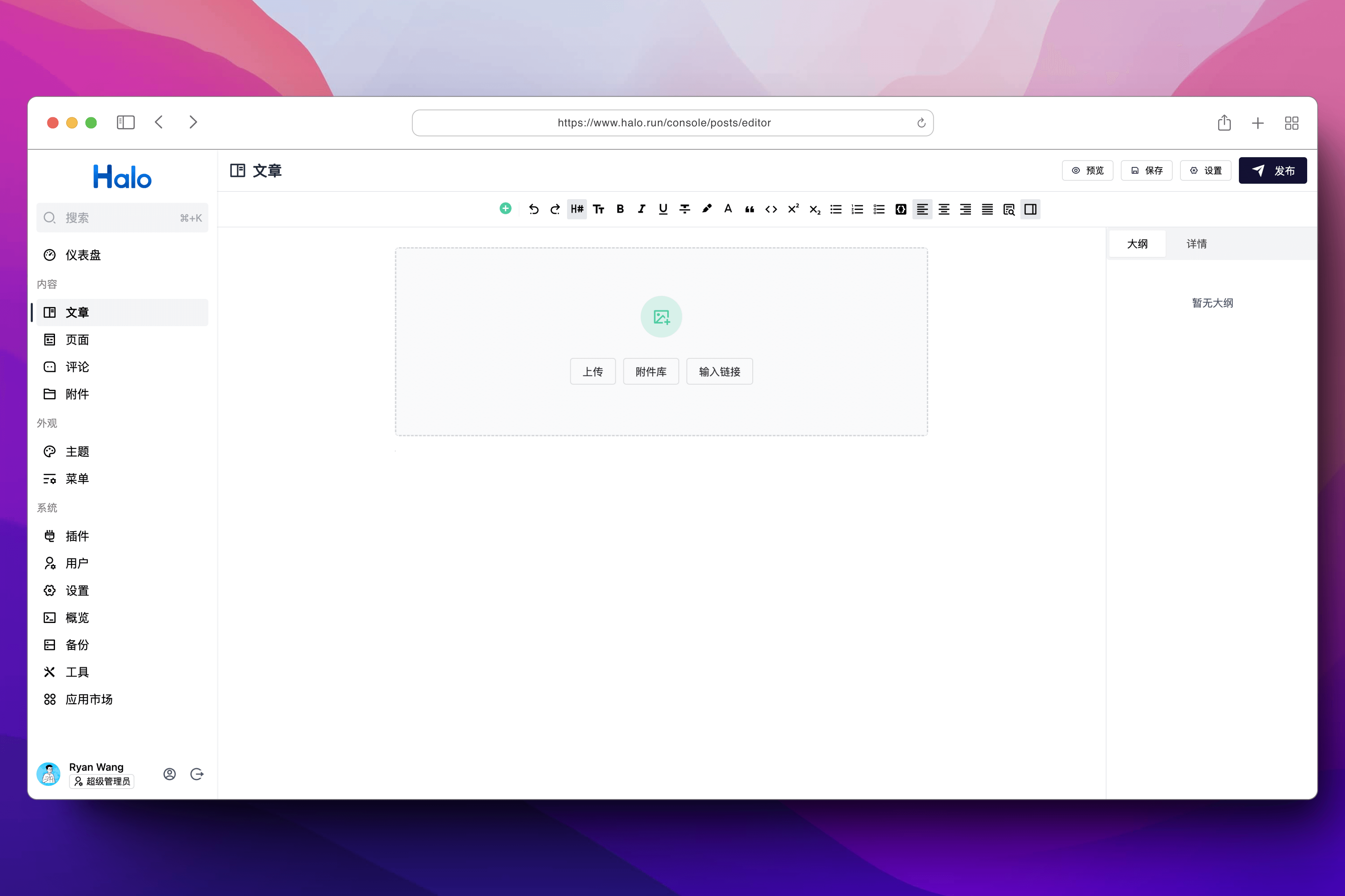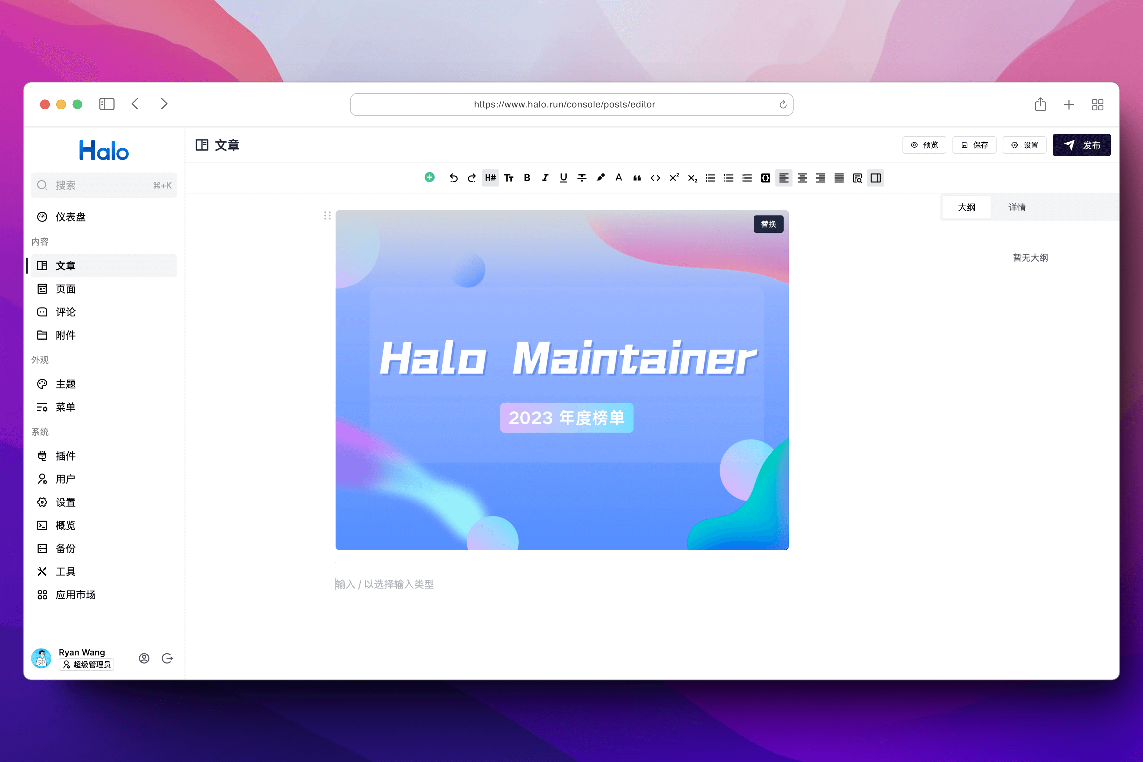 Halo 是一款强大易用的开源建站工具,它让你无需太多的技术知识就可以快速搭建一个博客、网站或者内容管理系统。具备可插拔架构、主题套用、富文本编辑器等多重特性,支持用户根据自己的喜好选择不同类型的插件及主题模板来定制化自己的站点功能及外观。让内容创作和发布更加便捷生动。