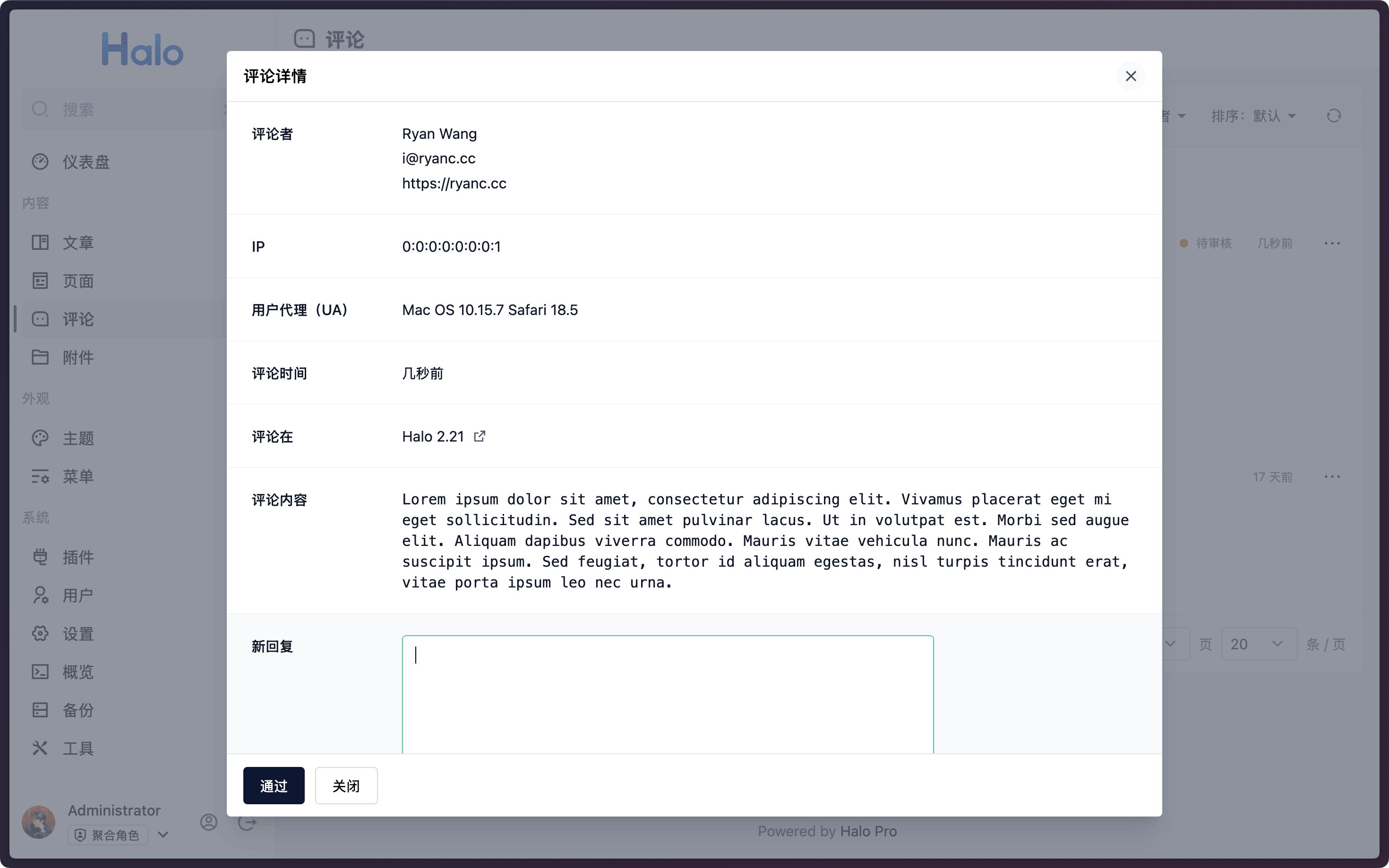 支持查看评论的详细数据,包括评论者信息、UA 等。